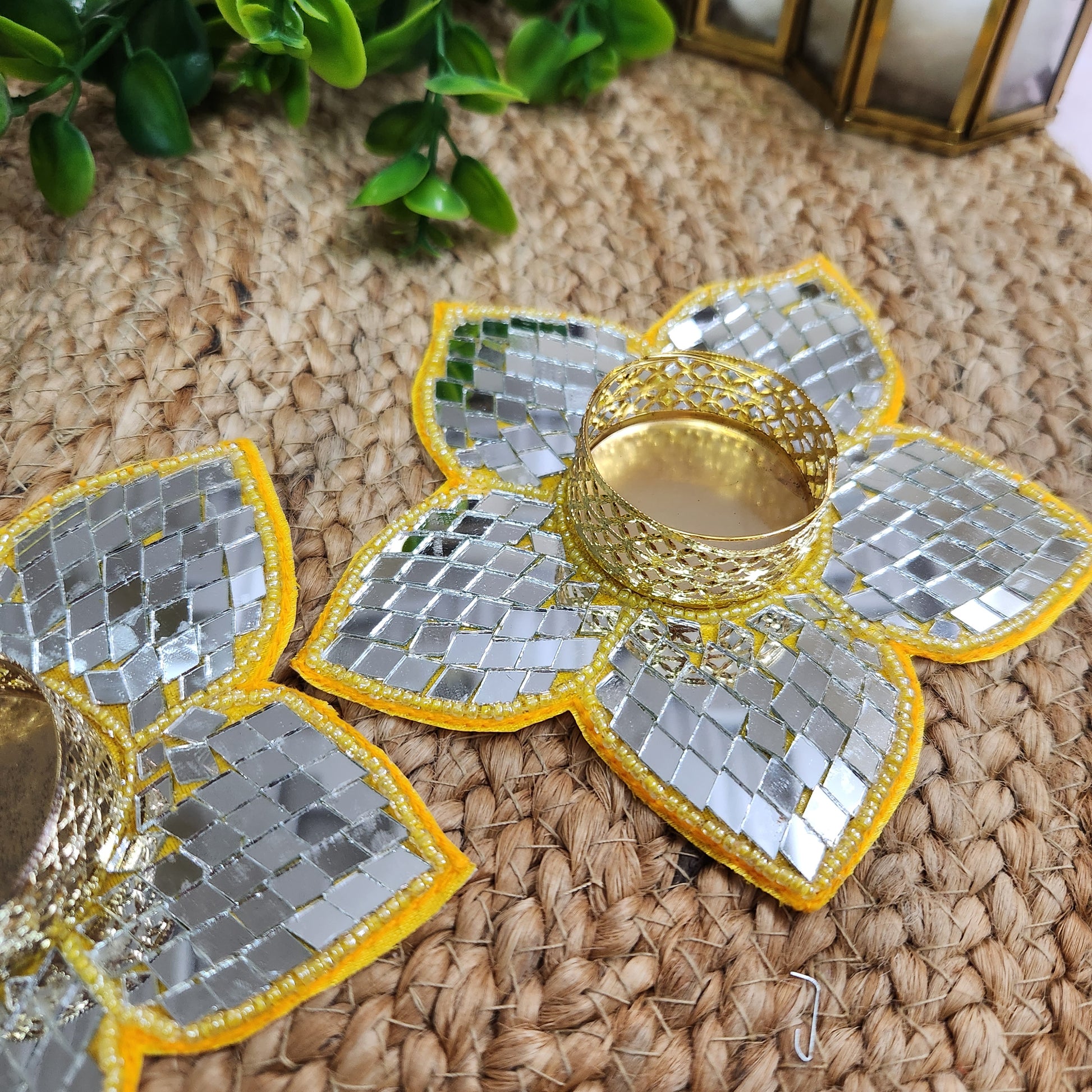Lotus Beads & Mirror Flower Booti Patch 2pc - Handcrafted Floral Diwali Decorative T Light Holder