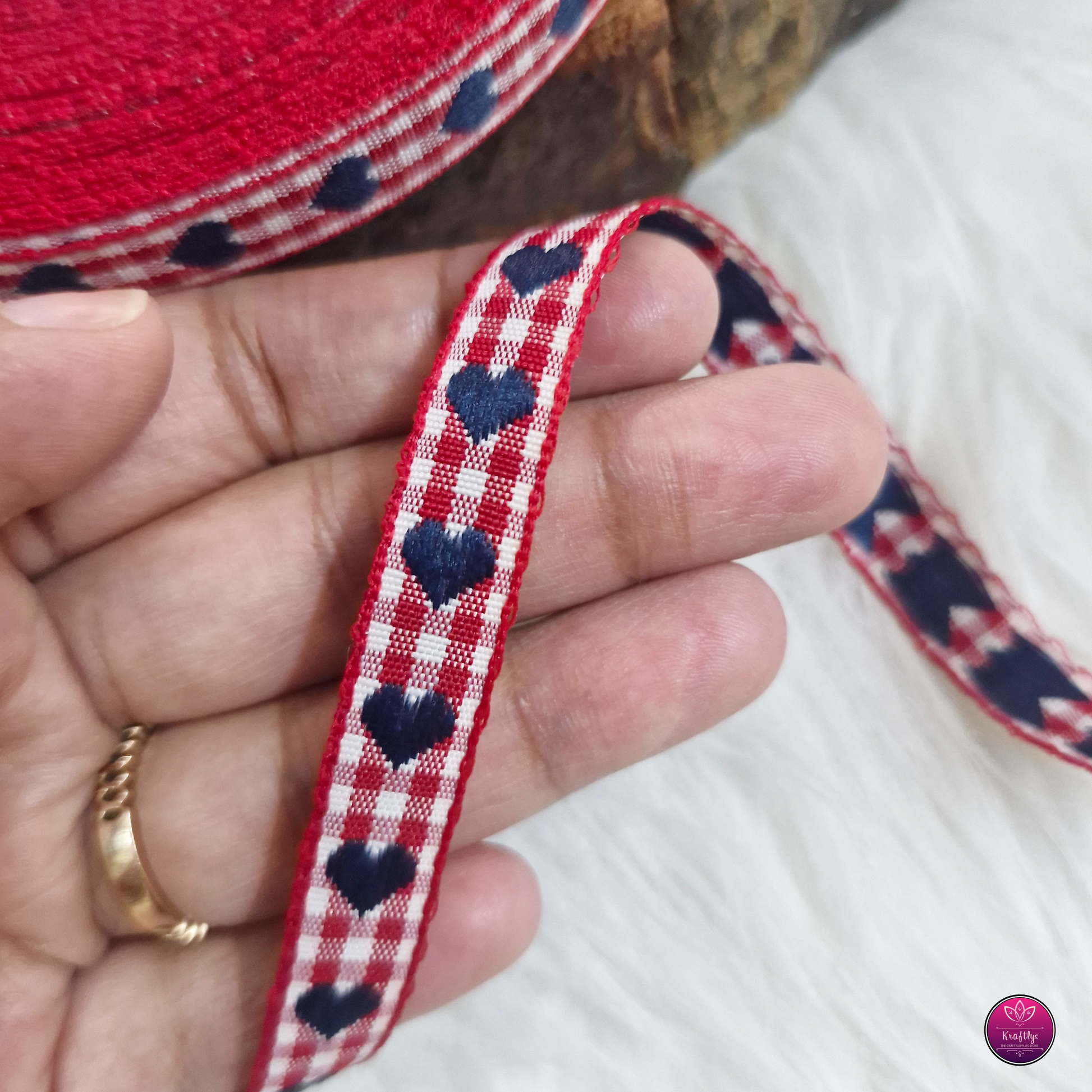 Narrow Red Checked Hearts Woven Ribbon 18 mtrs - Decorative Gift Wrapping Ribbon Roll